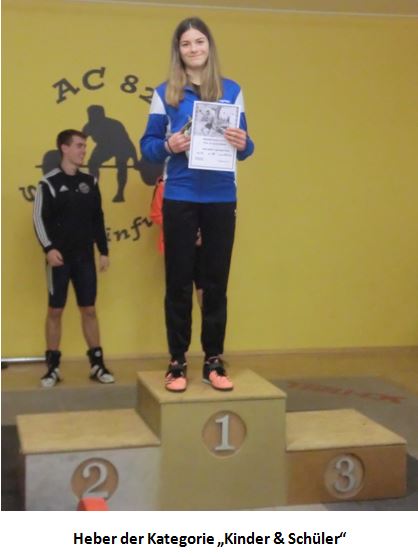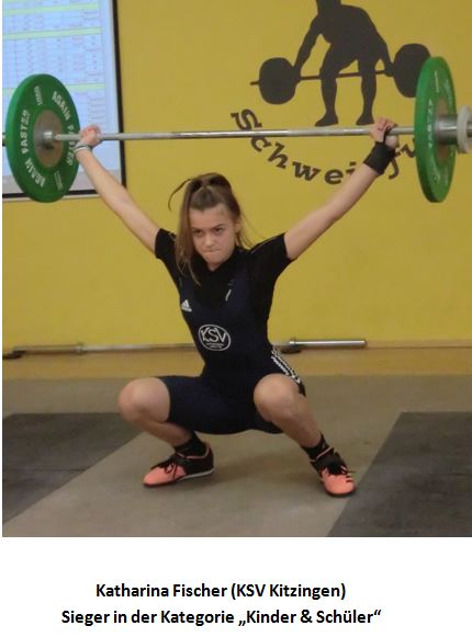 Bereits zum dritten Mal in Folge holte sich Katharina Fischer (KSV Kitzingen) den Sieg in der Kategorie "Kinder & Schüler". Zwar war sie in diesem Jahr einzige Starterin in dieser Kategorie; dennoch schonte sie sich nicht. Nach sechs gültigen Versuchen konnte sie 98 kg im Zweikampf verbuchen, was eine Steigerung von tollen 25 kg zum Vorjahr bedeutete.