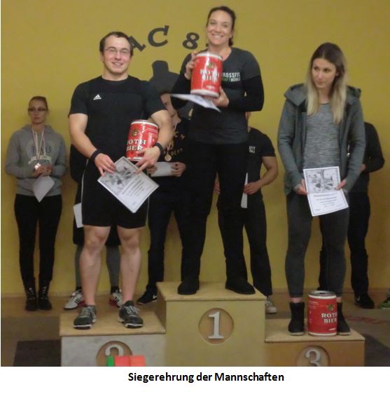 8 Mannschaften hatten gemeldet. Mit 1.184,1 Punkten siegte verteidigte die CrossFit KraftMühle Würzburg Platz 1. Der AC 82 Schweinfurt belegte mit 1.140,07 Punkten Platz 2 vor CrossFit Erlangen mit 1.034,95.