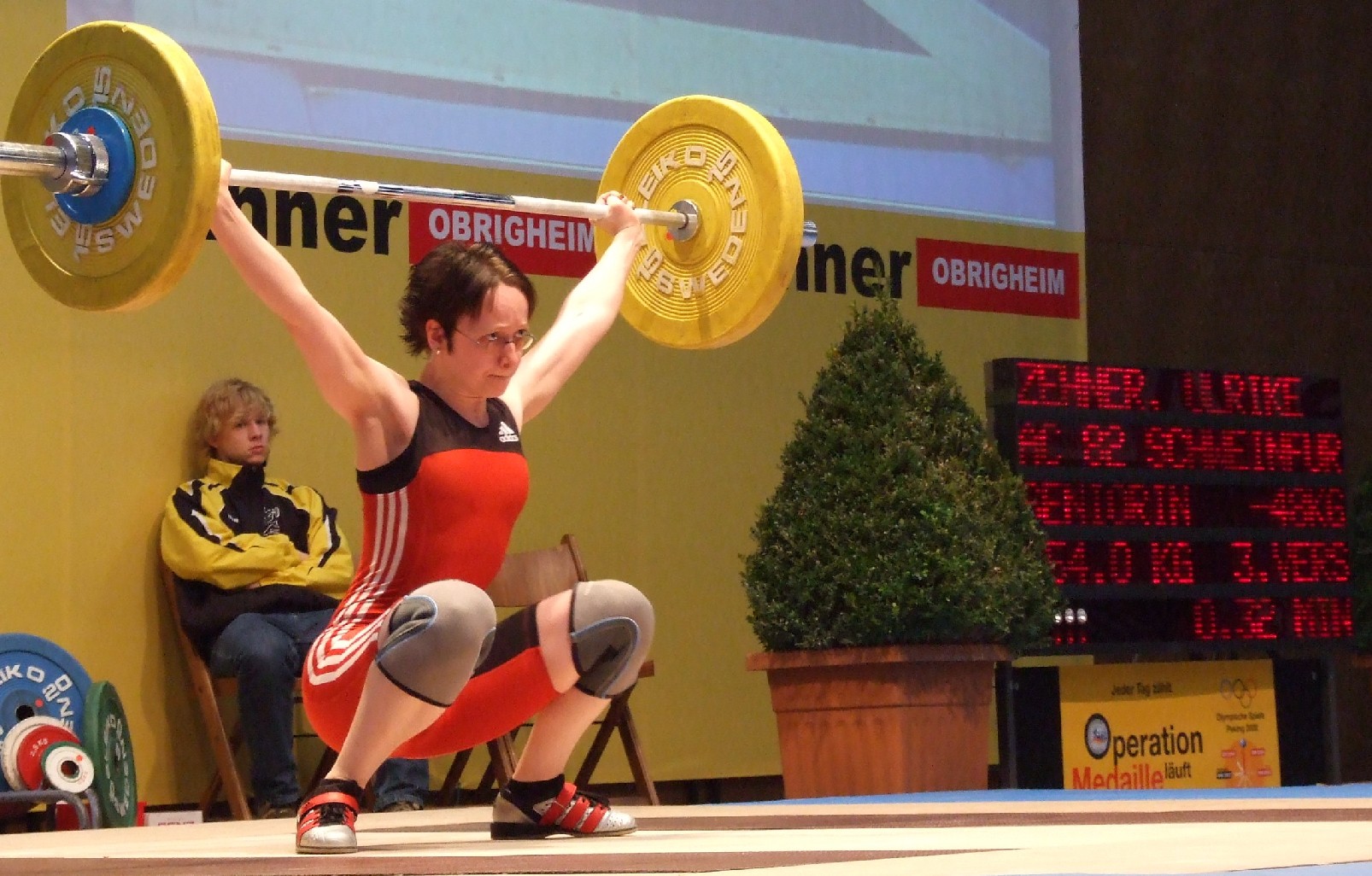 Das alles geschah im Jahr 1992. Und danach erlebte die Neu-Gewichtheberin einen steilen Aufstieg. Schon ein Jahr später wurde sie erstmals Bayerische Jugendmeisterin und verteidigte ihren Titel in den folgenden beiden Jahren. 1994 startete sie außerdem bei den Deutschen Meisterschaften - und holte sich auf Anhieb die Goldmedaille. Vereins- | Ulrike Zehner beim Wettkampf für ihren Heimatverein AC 82 Schweinfurt. Ihre größten Erfolge feierte sie aber in der Zeit beim KSV Kitzingen | und Auswahltrainer bescheinigten der Schweinfurterin ein großes Talent, das sie auch auf internationaler Ebene auf die vordersten Plätze katapultierte. 1995 kam sie beim Copenhagen Weightlifting Cup mit einer überzeugenden Leistung auf den zweiten Platz. |