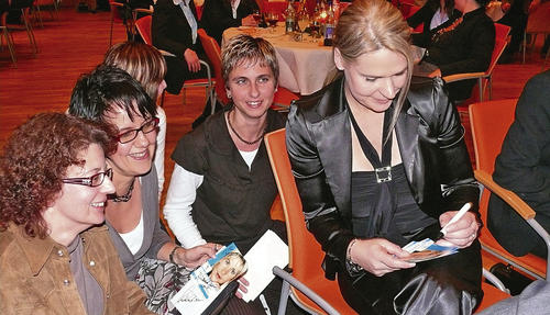 Spitzensportlerinnen unter sich: Vor der mehrfachen Eisschnelllauf-Weltmeisterin und -Olympiasiegerin Gunda Niemann-Stirnemann gingen selbst die Erstliga-Keglerinnen des ESV Schweinfurt artig auf die Knie für ein Autogramm.