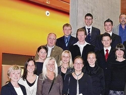 Stolze Jugendliche: die Einzelsieger und die Mannschaftsführer bei der Schweinfurter Sportgala mit Oberbürgermeisterin Gudrun Grieser (links) und Karl-Heinz Kauczok, Vorsitzender des Stadtverbandes für Sport (rechts).