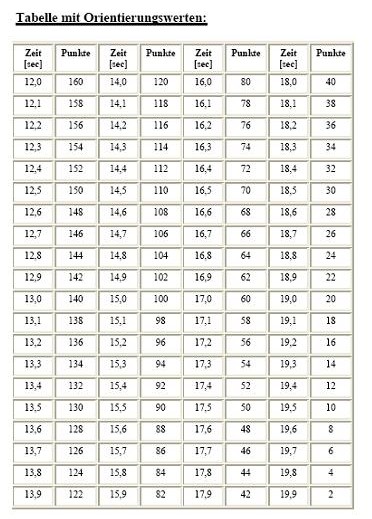 15,0 Sekunden entsprechen 100 Punkten. Jede 1/10 Sek. schneller/langsamer ergibt 2 Punkte mehr/weniger.